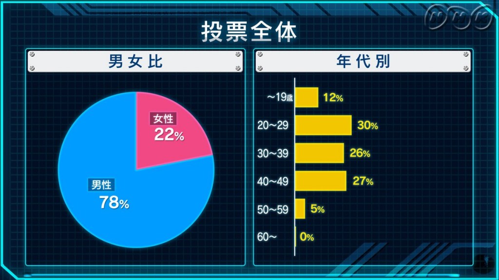 “กันดั้ม” อนิเมชั่นที่เป็นแรงบันดาลใจให้กับคนหนุ่มสาวผู้ชื่นชอบในเทคโนโลยี และวิศวกรรมจักรกล รวมไปถึงอุตสาหกรรมต่างๆ ทำให้ทางสถานีโทรทัศน์ NHK ได้ทำการสำรวจในหัวข้อ “All Gundam Big Voting 40th” โดยผลโหวตจะแบ่งเป็น 4 ส่วน ได้แก่ อนิเมกันดั้มยอดนิยม / โมบิลสูทยอดนิยม / ตัวละครยอดนิยม และ เพลงประกอบยอดนิยม โดยแบ่งเป็นชาย 78% และ หญิง 22%