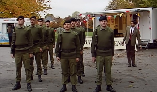 ในตอนที่ชื่อว่า Back to School Mr. Bean ที่เขาต้องกลับไปเยือนโรงเรียนเพื่อสร้างความวายป่วง ซึ่งในฉากแรก เขาเห็นเหล่าทหารกำลังโชว์เดินสวนสนาม ก่อนจะโชว์ระเบียบแถวหนึ่งครั้ง ก่อนที่ผู้บังคับบัญชาจะไปทำธุระ ทำให้พี่บีนได้มีโอกาสเป็นผู้บังคับบัญชาสั่งระเบียบแถวเหล่าทหาร ในแบบฉบับของเขาเอง (ฮ่า!)