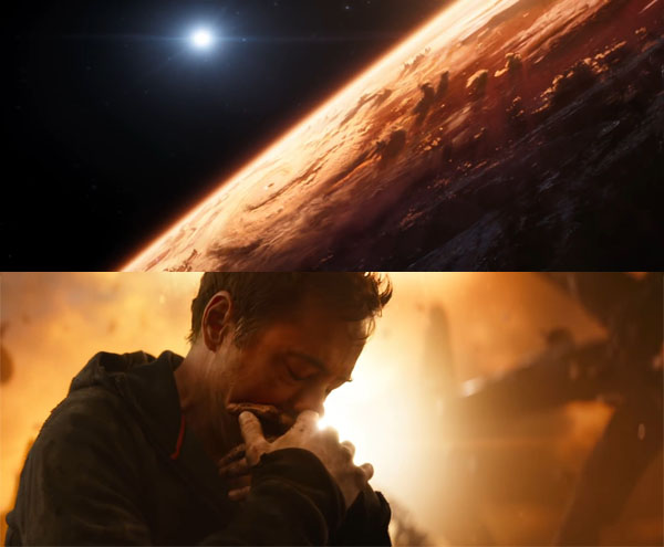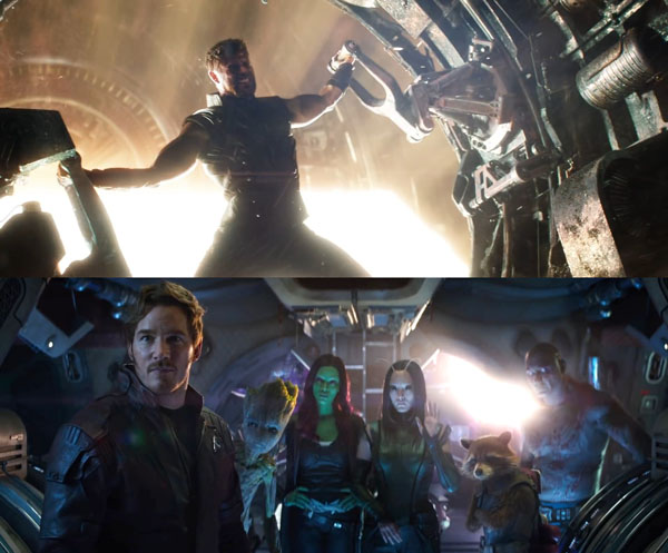 ถ้าเราย้อนกลับไปในช่วง end credit แรกของ Thor : Ragnarok หลังจากที่ธอร์ตัดสินใจจะพาชาวแอสการ์ดที่เหลือมายังโลก แล้วอยู่ๆก็มีภาพของยานขนาดมหึมาตรงหน้า (เดาไม่ยากเลยว่ายานใคร “ธานอส”ไง จะใครล่ะ) แน่นอนว่า ยานของธอร์โดนถล่มยับ ส่งผลให้เทพสายฟ้าของเราลอยเท้งเต้งอยู่ในอวกาศ และลอยมาชนยานมิลาโน่ของสตาร์ลอร์ดนั่นเอง (มีซีนนี้ในเทรลเลอร์ของงาน SDCC2017 หรือ ซานดิอาโก้ คอมมิคคอน 2017 ครับ)