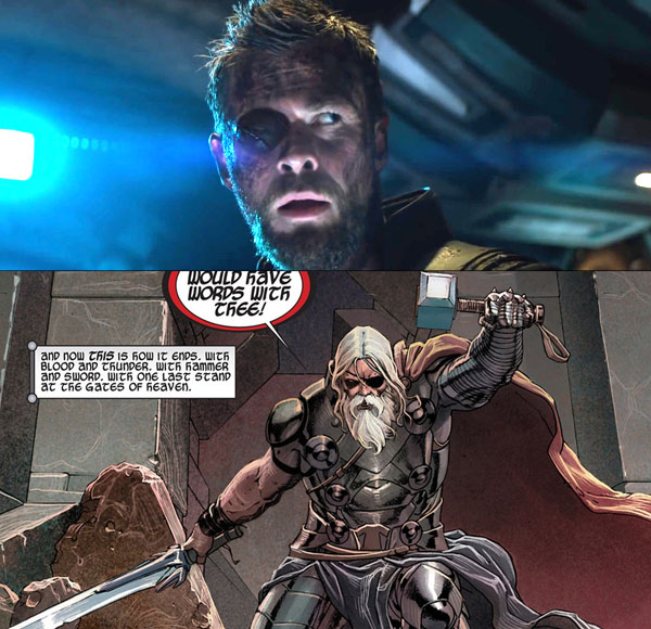 หลังจากที่เทพสายฟ้า ธอร์ โอดินสัน ได้กลายเป็นเทพสายฟ้าจริงๆ ปล่อยสายฟ้าได้เองแล้ว (ไม่ใช่เทพแห่งค้อนสายฟ้าเหมือนภาคก่อนๆ) แต่การต่อสู้กับเฮร่า ราชินีผู้ชั่วร้าย ทำให้ธอร์ต้องสูญเสียตาไปข้างหนึ่ง ทำให้อิมเมจของเทพสายฟ้าของเราใกล้เคียงกับ “โอลด์คิงธอร์” หรือ “ราชาธอร์ตอนแก่” ในหนังสือการ์ตูน ทั้งสเกลความสามารถที่ดูคล้ายๆ จะขาดก็แค่ “แขนของเดสทรอยเยอร์” ที่มาแทนแขนของธอร์ที่ถูกตัดจากการต่อสู้กับ Gorr The God Butcher (กอรร์ ผู้สังหารเทพ) กับ ดาบ All-Black The Necrosword (เนโคร ดาบแห่งความมืดทั้งปวง) แต่บางฉบับก็ใช้ขวานนะ