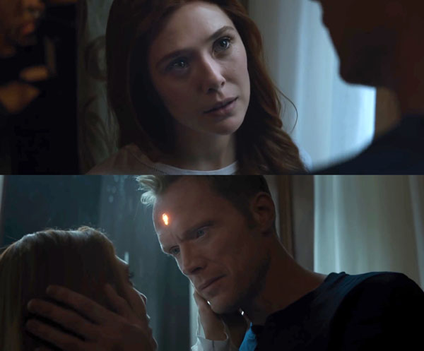 ในเทรเลอร์เราจะเห็นร่างมนุษย์ของวิชั่น ที่เราๆไม่เคยเห็นในหนังภาคก่อนๆ แน่นอนว่ามันเกิดคำถามเล็กๆว่า เกิดอะไรขึ้นกับวิชั่น  มันเป็นเรื่องจริง หรือภาพลวงตาที่ สการ์เลตวิทช์ หรือ วานด้า แม็กซีมอฟ  สร้างให้เราๆเห็นเป็นร่างคนจริงๆเพื่อความฟินของกองอวยคู่นี้ (55+) รวมไปถึงการที่มีภาพของสการ์เลต วิทช์ ในห้องนอนกับวิชั่น ก็น่าจะบ่งบอกถึงความสัมพันธ์ที่คืบหน้าไปมากพอสมควร แต่น่าเสียดายที่ตัวอย่างนี้สปอยล์มาว่า วิชั่นจะต้องเจอกับความเจ็บปวดอย่างสาหัส ทำเอาให้คิดเลยว่า หมอนี่น่าจะสังเวยให้กับอีเว้นท์นี้ แน่ๆ โถ..คนกำลังฟินกับคู่นี้เลย…