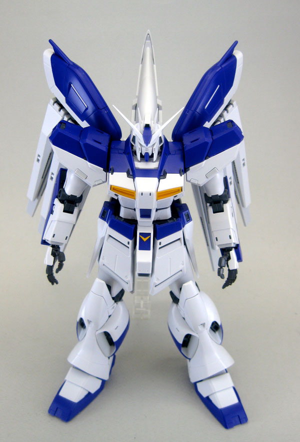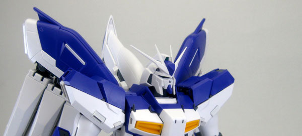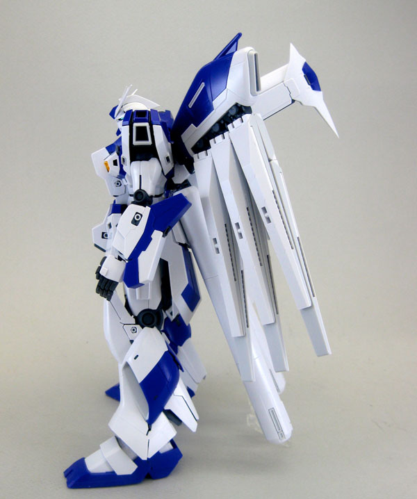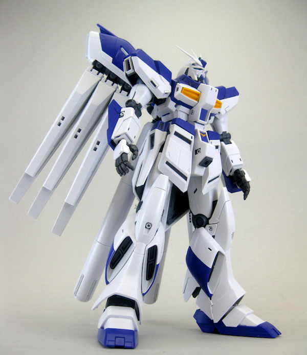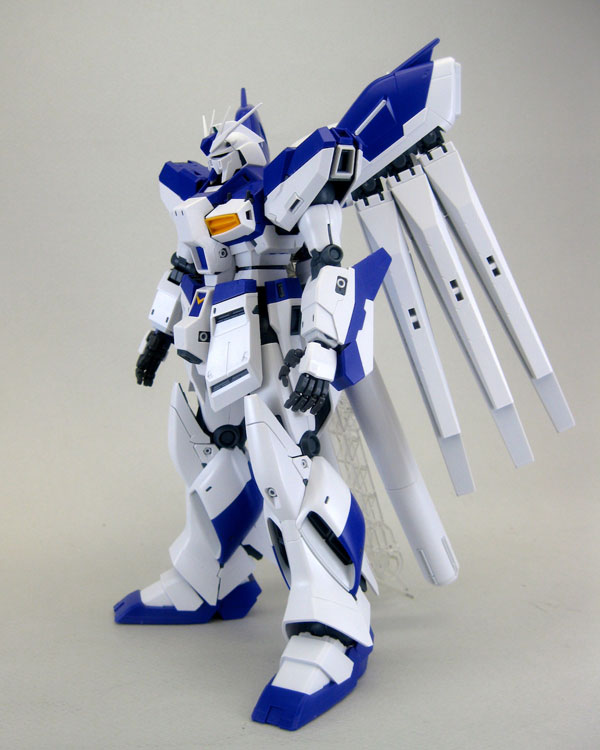 โดย Hi-Nu นั้นถูกพัฒนาต่อจาก Nu Gundam ที่อามูโร่ขับ โดยถือว่าเป็นนิวกันดั้มร่างสมบูรณ์ก็ว่าได้ โดยมีการปรับปรุงโดยติด Wing-Thruster เข้าไป โดยทำหน้าที่เพิ่มความเร็วและยังเป็นตัวชาร์จให้กับฟินฟันเนลอีกด้วย ทำให้สามารถชาร์จพลังงานให้กับฟันเนลผ่านตัว MS ทำให้ใช้งานฟันเนลได้ต่อเนื่องยาวนานยิ่งขึ้น