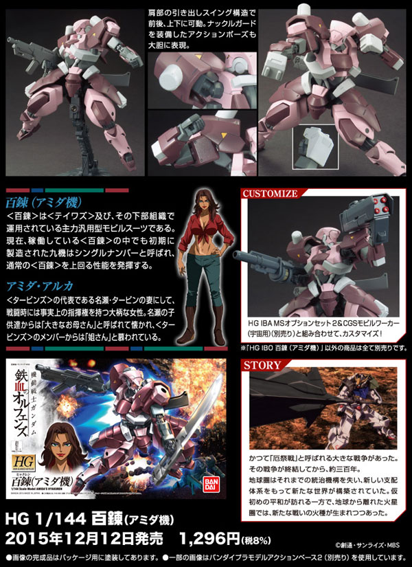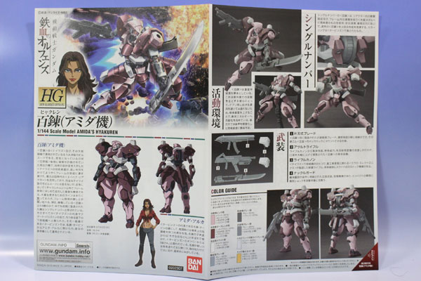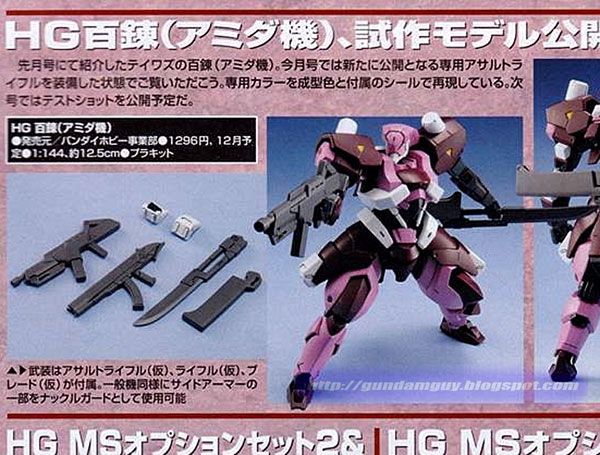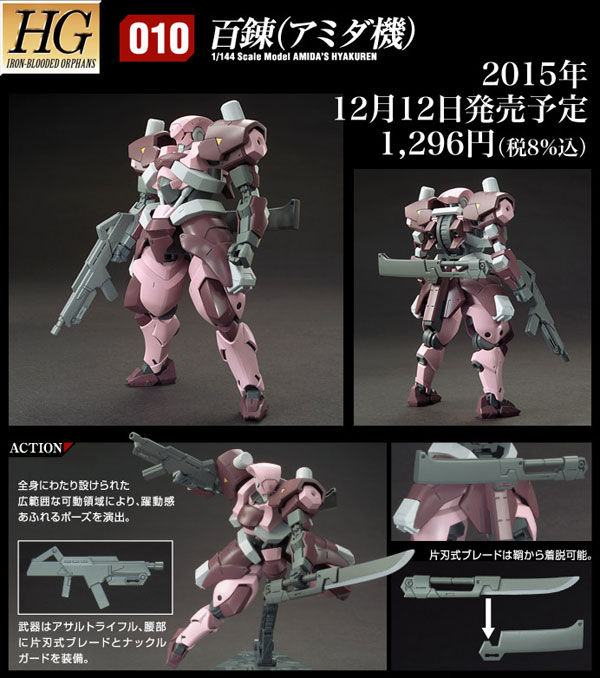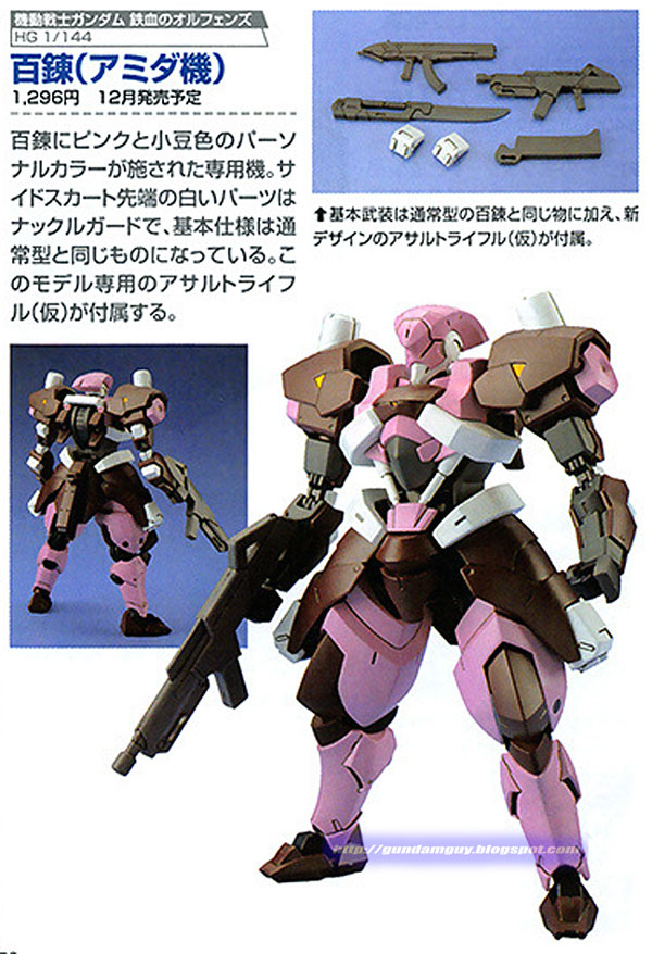 หุ่นประกอบ Gunpla ตัวนี้ เป็นหุ่นในซีรี่ส์ กันดั้มภาคใหม่ล่าสุด ที่พึ่งมีการออกฉายที่ญี่ปุ่นได้ไม่ถึง 10 ตอน ก็ติดกระแสลมบนเป็นที่เรียบร้อย ซึ่งหุ่นรบ Hyakuren (Amida) ตัวนี้ เป็นหุ่นที่มีต้นแบบมาจาก Hyakuren ถึงรูปร่างแทบทั้งหมดจะเหมือนกับ Hyakuren ตัวสีน้ำเงินที่ออกมาก่อนหน้านี้ แต่ก็ยังมีข้อแตกต่างที่เห็นได้ชัด นั่นก็คือ สีของชุดเกราะของเจ้าตัว Amida จะเป็นสีชมพูตัดแดงเลือดหมู โดยมีนักบินประจำหุ่นเป็นหญิงสาวผิวสีเข้ม นามว่า Amida Arca สำหรับหุ่นตัวนี้ มีกำหนดออกวางจำหน่ายในเดือนธันวาคมนี้
