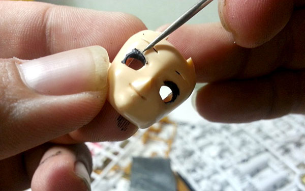 จากนั้น เอา “พู่กันเบอร์ 0” จุ่มสีดำ XF-1 ที่ผ่านการผสมตัวทำละลาย X20 เอามาวาดรอบๆขนตาครับ แล้วรอให้แห้ง ถ้าสีจะเกินๆล้นๆออกมาไม่เป็นไรครับ เพราะสีชนิดนี้เวลาแห้งแล้ว เราสามารถใช อาร์ตไนฟ์ เข็ม หรือสำลีปั่นหูชุบ X20 เช็ดส่วนที่เกินออกได้