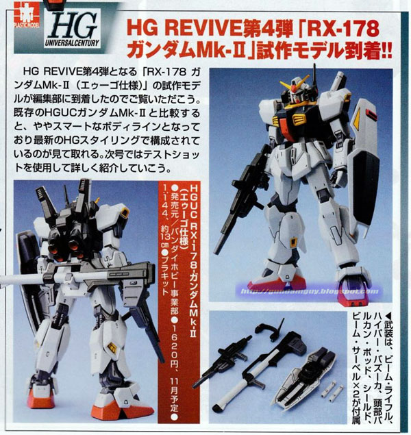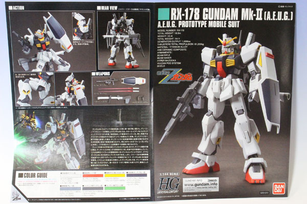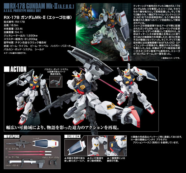 หุ่นประกอบ Gunpla ตัวนี้ เป็นหุ่นรบตัวเอกเครื่องแรกในภาค Zeta Gundam (กันดั้มเซต้า) Gundam MK-II เป็นหุ่นที่มีสีเทาดำซึ่งทิทานส์สร้างขึ้นมาจากพื้นฐานของ RX-78-2 โดยทิทานส์ได้ตั้งใจไว้จะให้เป็นหุ่นรบที่มีแบบการผลิตในจำนวนมาก แต่ในเวลาต่อมาหุ่นรบต้นแบบก็ได้ตกไปอยู่ในการครอบครองขององค์กรเอวโก้ (A.E.U.G.) โดยทางสหพันธ์ได้ส่ง Gundam MK-II เครื่องหนึ่งไปยังบริษัทแอนาไฮม์อิเล็กทรอนิกเพื่อทำการศึกษาโครงสร้างของมูฟเอเบิ้ลเฟรม อีกสองเครื่องได้ถูกแยกชิ้นส่วนเพื่อเป็นอะไหล่เสียหนึ่งเครื่อง และอีกเครื่องถูกทาสีใหม่ เป็นสีขาวน้ำเงินแทน โดยมีนักบินประจำ คือ คามิล บีดัน (Kamille Bidan) และต่อมาได้เปลี่ยนนักบินเป็น เอมม่า ชีน (Emma Sheen) สำหรับอาวุธเสริมต่าง ๆ ของ RX-178 Gundam Mk-II ได้แก่ Vulcan Pod , Beam Saber , Hyper Bazooka , Beam Rifle , Shield (missile)
