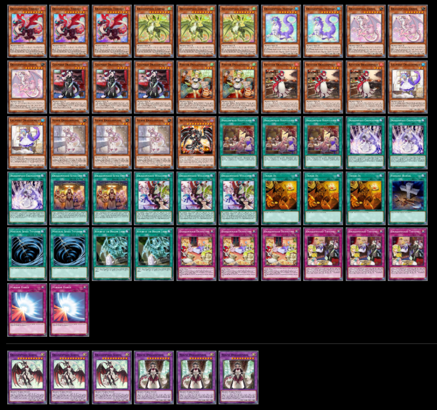 Dragonmaids เป็นอีกเด็คสายคอมโบต่อเนื่องในการอัญเชิญพิเศษ การแก้ทางที่น่าจะเข้าทาที่สุด คงไม่พ้นการปา MaxxC เพื่อกดดันให้การอัญเชิญพิเศษของฝ่ายนั้นต้องคิดหนัก เพราะทุกการลง จะเติมมือให้เรา 1 ใบ