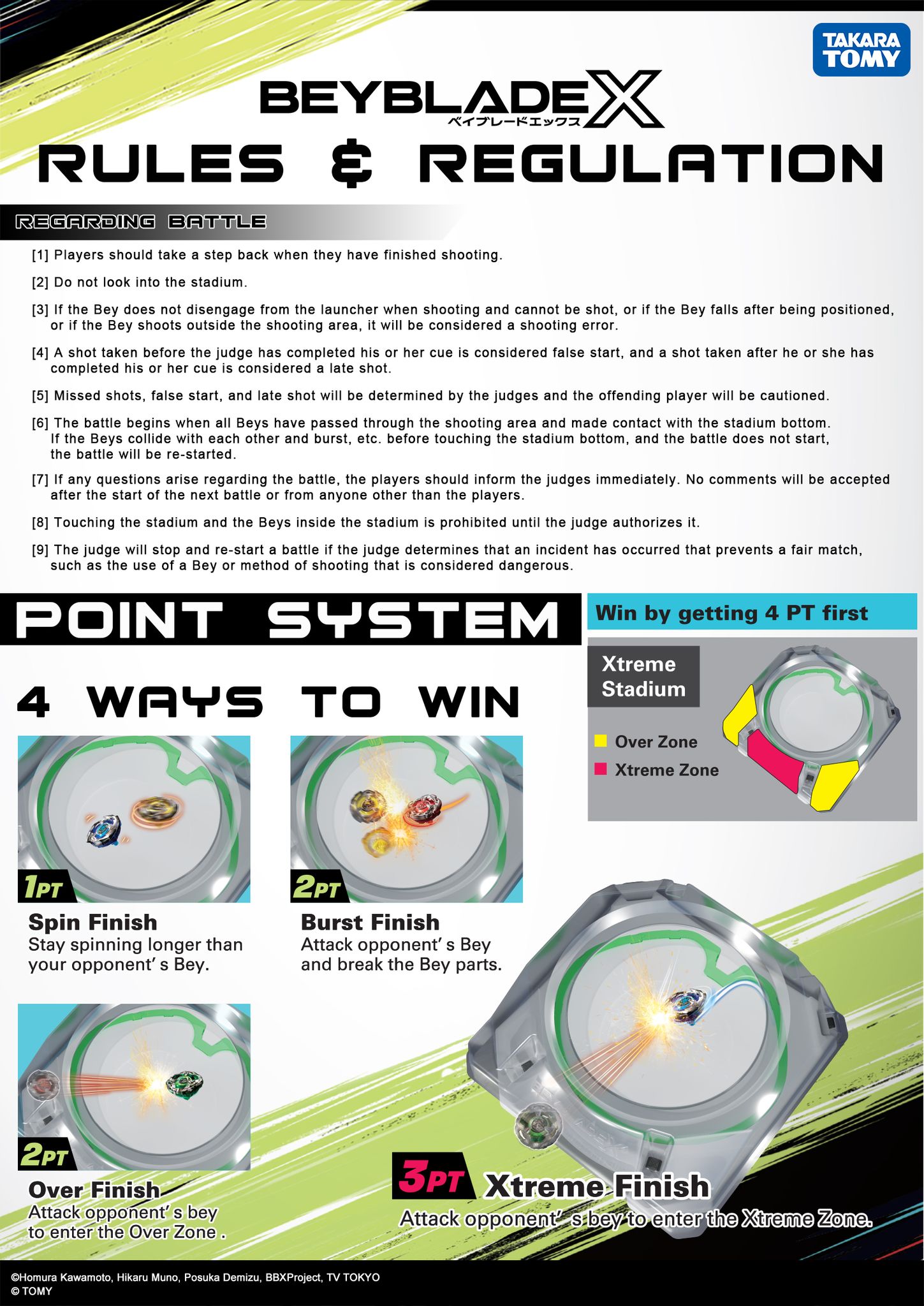 การศึกษากฏให้เข้าใจในวันสองวันอาจจะเป็นเรื่องยาก แต่ถ้าคุณค่อยๆเล่น ค่อยๆเรียนรู้มาตลอด + ถามในคอมมูนิตี้คนเล่นเบย์เบลด ก็อาจจะค่อยๆซึมซับจำกฎต่างๆให้ขึ้นใจได้