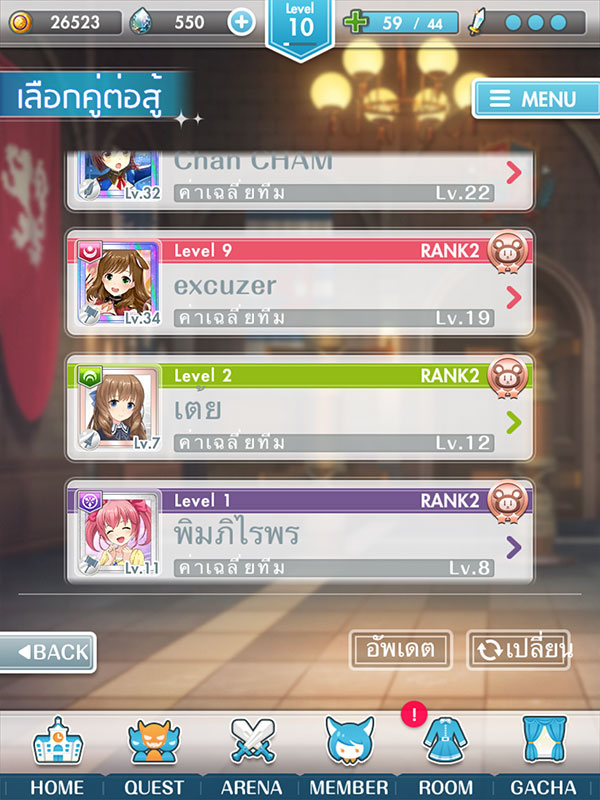 เลือกคู่ต่อสู้ที่เราคิดว่าจะตบให้คว่ำ เอ๊ย..!! เอาชนะได้ หากหาคู่ต่อสู้ที่เหมาะมือไม่ได้ก็ให้กดที่ “อัพเดต” เพื่อรีเฟรซหาคู่ต่อสู้ใหม่ กด “เปลี่ยน” เพื่อดูตัวละครในทีมของฝั่งคู่แข่งได้