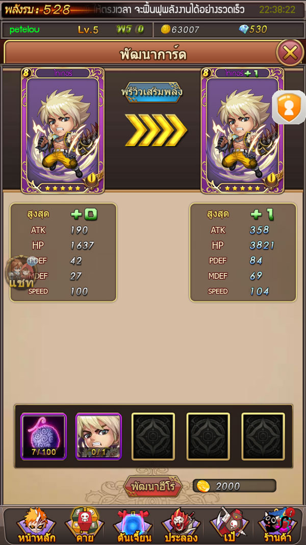 ตัวเอก : ปรับแต่งตัวละครหลัก สามารถพัฒนาการ์ด เพื่อเปลี่ยนร่างตัวละครหลักให้เป็นตัวที่เท่และเก่งขึ้น โดยจะใช้ไอเทมที่กำหนดหรือเหรีญทองในการอัพเกรด