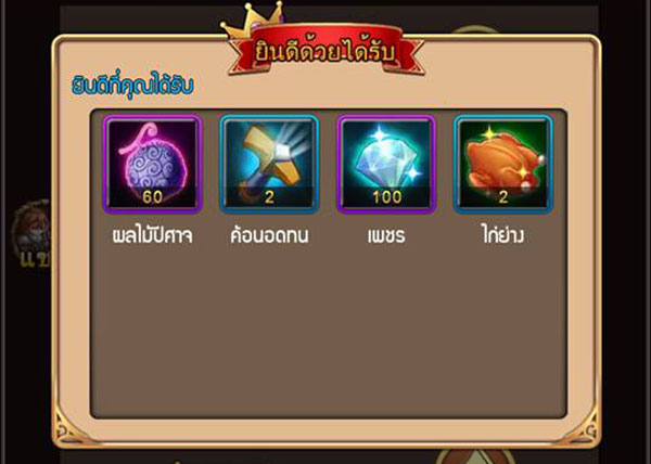 ผลไม้ปีศาจ x60 / ค้อนอดทน x2 / เพชร x100 / ไก่ย่าง x2