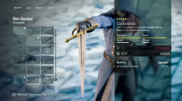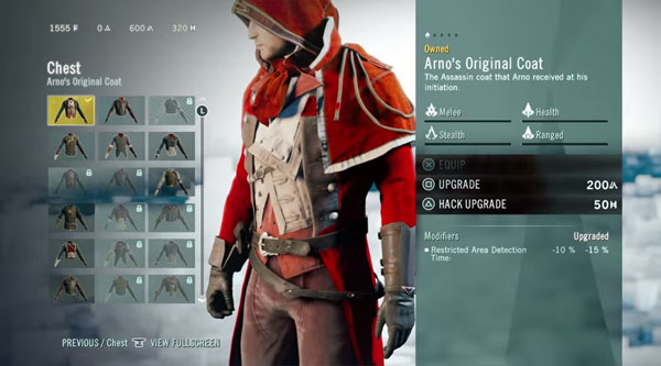 การหาอาวุธและเสื้อผ้าใหม่ๆมาใช้ สามารถหาซื้อได้ด้วยเงิน F (Franc) ค่าสกุลเงินของฝรั่งเศษ ซึ่งสามารถหาได้ภายในเกมส์โดยการล้วงกระเป๋าชาวบ้าน หรือรับเงินรางวัลจากการทำภาระกิจช่วยเหลือชาวเมือง ส่วนการอัพเกรดอาวุธและเสื้อผ้าจำเป็นต้องใช้ค่า “/A” (Creed Points) ซึ่งหาได้การสำเร็จเงื่อนไขท้าความตายหลายรูปแบบ ภายในเกมส์