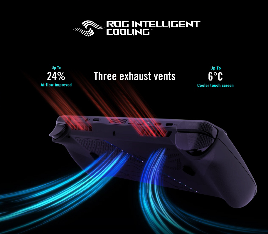 ROG Ally X ได้รับการออกแบบมาเพื่อให้คุณเล่นได้ทุกที่ ดังนั้นจึงจำเป็นต้องมีระบบระบายความร้อนที่เข้ากัน มาพร้อมกับท่อระบายความร้อนที่ออกแบบมาเป็นพิเศษซึ่งทำงานด้วยประสิทธิภาพสูงสุดในทุกทิศทาง และช่องระบายอากาศช่องที่สามแบบใหม่เพื่อช่วยให้เมนบอร์ดและแผงระบายความร้อน