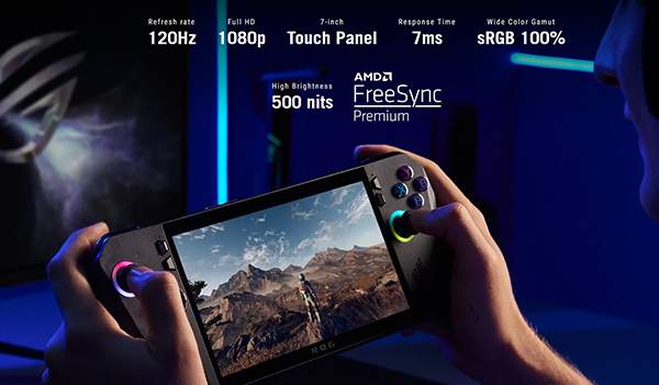 หน้าจอขนาด 7 นิ้วที่มีความละเอียด 1080p และอัตราการรีเฟรช 120Hz พร้อมรองรับ FreeSync™ Premium ทำให้การเล่นเกมเป็นเรื่องที่สนุกสนานอย่างแท้จริง ในขณะที่หน้าจอ LCD ทั่วไปมีความสว่างสูงสุดประมาณ 200-300 nits, Ally X สามารถปรับความสว่างได้ถึง 500 nits ด้วยความสว่างที่สูงขึ้นช่วยให้ Ally X แสดงภาพบนหน้าจอได้อย่างชัดเจนเมื่ออยู่ในสภาพแวดล้อมที่มีแสงสว่าง พร้อมค่าขอบเขตของสีแบบ sRGB 100%
