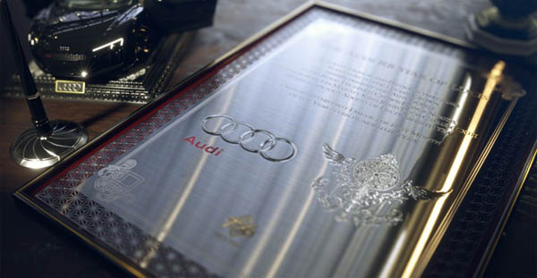 ทางบริษัทออดี้ ได้ทำการใส่เรื่องราวลงไปในตัวผลิตภัณท์สุด Exclusive นี้ว่า เป็นรถที่ทาง ออดี้ และ สมาคมผู้สร้างงานศิลปะแห่งอาณาจักรลูซิส ได้สร้างรถคันนี้ให้เป็นของขวัญ ถวายแด่เจ้าชาย “น๊อคติส ลูซิส เคลัม” ในวันครบรอบวันเกิด เน้นสีดำที่เป็นสัญลักษณ์ของราชวงษ์ลูซิสอันโดดเด่น และในวันที่เจ้าชายน๊อคติสอายุถึงเกณฑ์ทำใบขับขี่ ก็มักจะนำเอาม้าพยศคันนี้ออกวิ่งด้วยความคึกคะนองทั่วอาณาจักรลูซิสยามค่ำคืน ซึ่งก็ขับด้วยความเร็วในระดับชวนหวาดเสียวแก่พสกนิกร และชาวบ้านที่อยู่ในละแวกนั้น