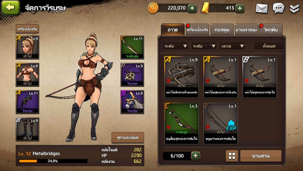 อาวุธในเกมตอนนี้มีเพียง ธนู กับหน้าไม้เท่านั้น ซึ่งอุปกรณ์สวมใส่ในเกมก็จะมีการแบ่งเกรดอย่างชัดเจน (เกรด S-D ) แต่ทว่าของเกรดต่ำ แต่มีค่าความหายากสูง (สีม่วงหายากสุดในเวลานี้) ก็จะมีค่าสถานะที่สูงกว่า แต่ถ้าเป็นของเกรดสูง แถมมีค่าค่าความหายากสูง ก็จะกลายเป็นไอเทมชั้นยอด