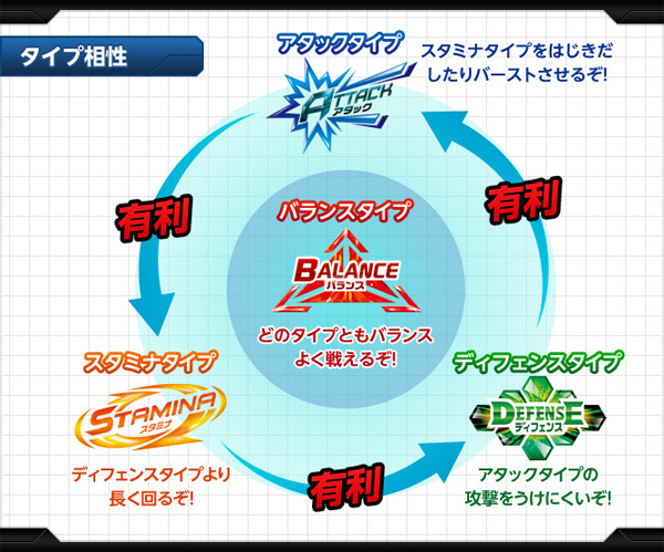 ด้วยเหตุนี้ประเภท Attack จึงมาเพื่อแก้ทางสาย Stamina เพราะความอึดของสายสตามิน่า จะหมุนนานที่สุด แต่ก็แลกกับน้ำหนักที่เบา และง่ายต่อการถูกเคาะจนออกจากสนามไป อย่างไรก็ตามสาย Attack เองก็แพ้ทาง สาย Defense ที่สามารถป้องกันการโจมตีประเภทต่างๆ แต่ก็ไม่ได้ผลเสมอไป