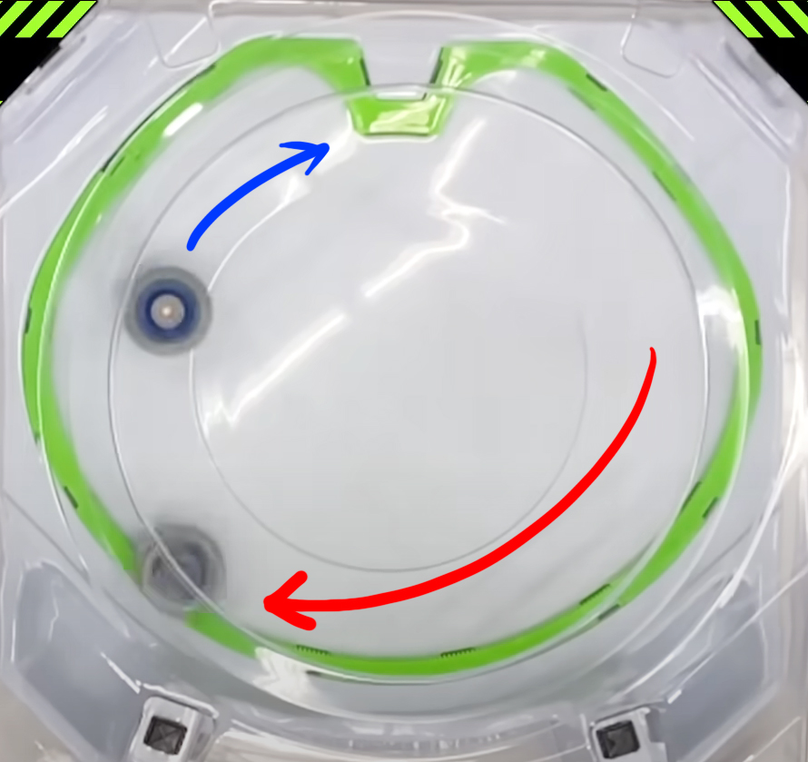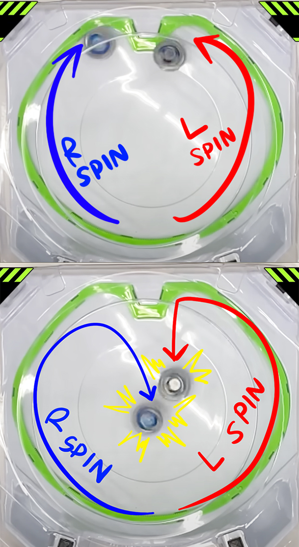 ซึ่งผลก็ต้องคล้ายกัน แต่อาจจะ “เกิดผลลัพท์” ที่หวังผลมากกว่าในการเข้าไปโจมตีด้วยทิศทางเดียวกัน แต่ทั้งนี้ก็ต้องอยู่ที่มุมในการเข้าโจมตีของเบย์เบลดแล้ว ใครจะชู้ตแรงตั้งต้นได้มากกว่า , มีพลังโจมตีได้แรงกว่า และโชคดีที่เบลดเข้าเหลี่ยมมุมถูกจุดมากกว่ากันครับ