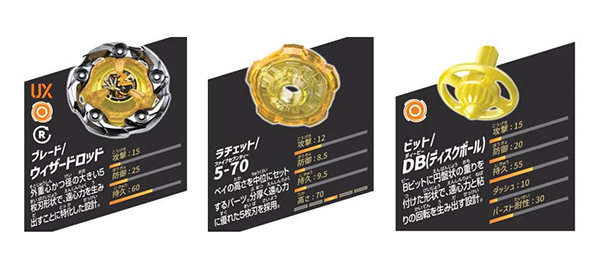 Wizard Rod เบลดใหม่ สาย Stamina ถูกออกแบบมาให้สามารถหมุนได้นานยิ่งขึ้นด้วยความโค้งมนและคมเขี้ยวที่มีถึง 5 จุด จะช่วยสร้างสมดุลในการหมุนให้นานขึ้น ต้องถูกใจคนเล่นสาย Stamina แน่นอน และเช่นเดียวกับ Hells Hammer เบย์เบลดตัวนี้ก็ได้รับแร็ตเช็ตรหัสใหม่อย่าง 5-70 มาด้วยเช่นกัน
