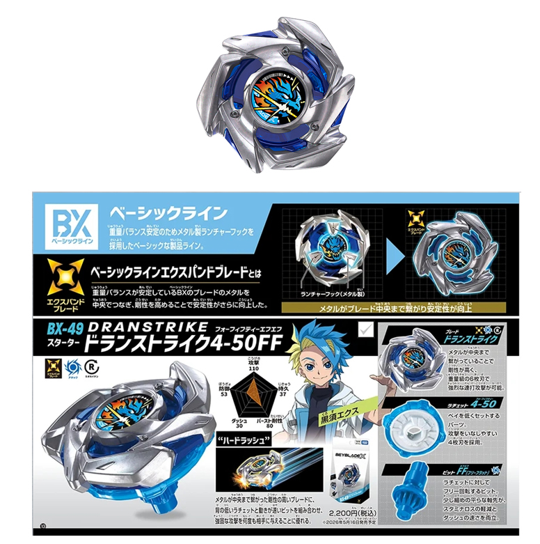 ในส่วนของ BX Expand Blade จากสาย Basic Line นั้นมีการปรับปรุงในด้านสมดุลและน้ำหนักเป็นหลัก จากเดิมที่ส่วนชิปตรงกลางจะเป็นแผ่นพลาสติกใสและหมุนได้ ในระบบ Expand Blade จะเปลี่ยนให้ส่วนชิปเชื่อมต่อกับส่วนที่เป็นโลหะโดยตรง การปรับเปลี่ยนนี้ช่วยให้การถ่ายเทน้ำหนักเข้าสู่ศูนย์กลางของเบลดทำได้ดียิ่งขึ้น ส่งผลให้สมดุลในการหมุนมีความเสถียรและทรงพลังมากกว่าเบลดในสายพื้นฐานรูปแบบเดิม ถือเป็นการยกระดับมาตรฐานใหม่ให้กับ Basic Line ได้อย่างน่าสนใจ