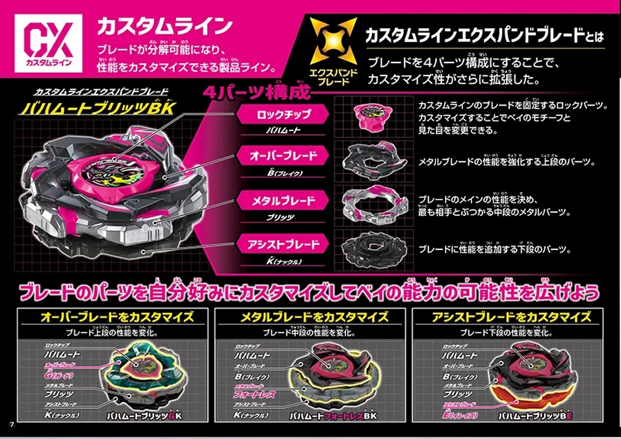 โดยในสาย CX Expand Blade ซึ่งเป็นกลุ่มแรกที่เปิดตัวนั้น ได้มีการเปลี่ยนโครงสร้างจากเดิมที่มี 3 ส่วนประกอบหลัก ได้แก่ ล็อคชิป เมนเบลด และแอสซิสต์เบลด ให้กลายเป็นระบบ 4 ส่วนประกอบ ด้วยการ แยกส่วนเมนเบลดเดิม ออกเป็น โอเวอร์เบลด และ เมทัลเบลด ส่งผลให้ผู้เล่นสามารถปรับแต่งสลับชิ้นส่วนระหว่างเบลดตัวอื่นในสายเดียวกันได้อย่างอิสระ มอบตัวเลือกในการสร้างสรรค์เบย์เบลดที่มีคุณสมบัติเฉพาะทางได้หลากหลายกว่าที่เคยเป็นมา