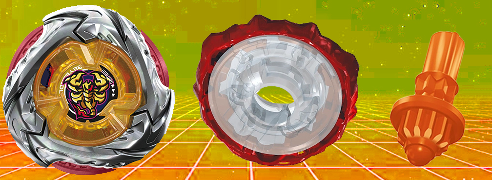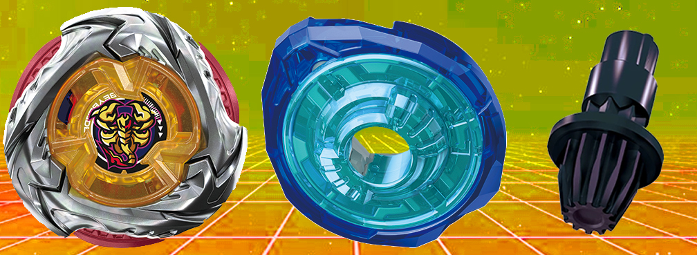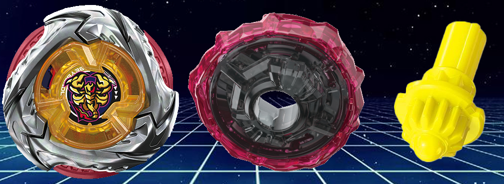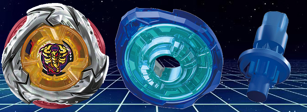 เบลด : Scorpio Spear เบลดสาย Balance ตัวใหม่ ที่มีรูปทรงคล้ายกับ Hells Hammer แต่มีการเพิ่มลูกเล่นเข้ามา เนื่องจากตัวเบลดสามารถเปลี่ยนโหมดได้ โดยที่โหมดแรกตอนก่อนชู้ต จะเป็นโหมดที่มี 6 คมเขี้ยว เน้นเสริมสร้างการหมุนที่สมดุล และเมื่อชู้ตไปแล้วลงสนามแล้ว จะสามารถเปลี่ยนโหมด เก็บเบลดรอง เหลือเบลดหลัก 3 อันเสริมแรงหมุนให้ตีแรงขึ้น