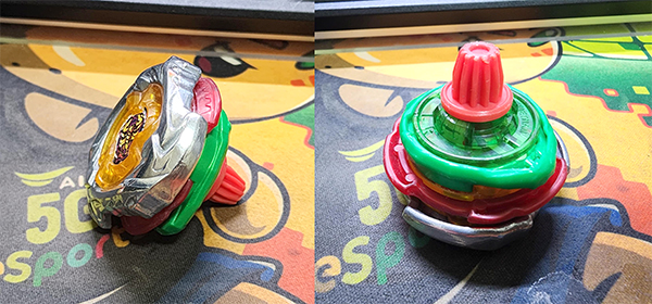 Before launching, the Beyblade displays red sub-blades, giving it a rounded shape and enhancing balance.