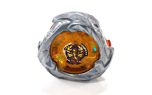 The Scorpio Spear resembles the shape of Hells Hammer, with a gimmick that allows it to switch modes. It starts in a 6-blade configuration for balance, then transitions to a 3-blade mode mid-spin to enhance attack power. This mode switch only occurs after launch.