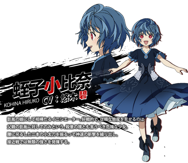 สาวตัวเล็ก เป็นอินนิเทียเตอร์ของคาเงทาเนะ ใช้การต่อสู้ในรูปแบบของเป็นตั๊กแตนตำข้าว (Model Mantis Initiator) นิสัยเหมือนเด็กๆ ช่างถามช่างสงสัย ขี้งอน แต่แฝงด้วยความอำมหิตเลือดเย็นอย่างไร้เดียงสา เรียกคาเงทาเนะว่า ป๊าป๋า