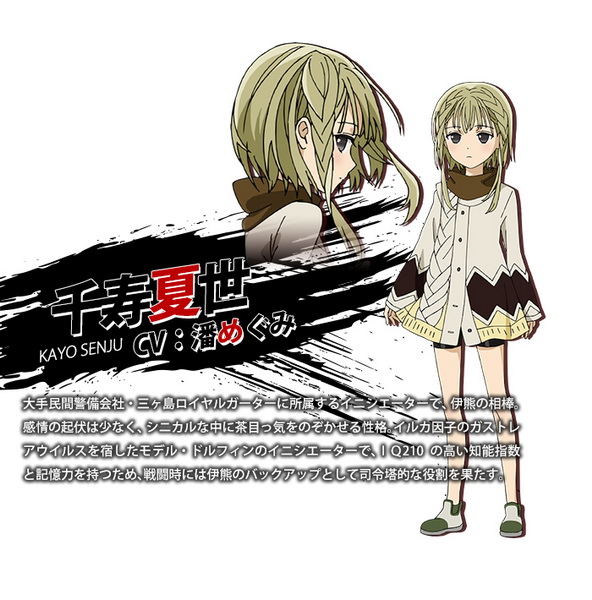 เด็กผู้หญิงที่เป็นอินนิเทียเตอร์ร่วมกับอิคุมะ ใช้การต่อสู้ในรูปแบบของเป็นโลมา (Model Dolphin Initiator) นิสัยดูนิ่งๆ เงียบ แต่เธอมีไอคิวสูงถึง 210 น่าเศร้าที่เธอต้องมาจบชีวิตหลังจากที่ต้องต่อสู้กับเหล่ากาสเตรย์ ก่อนที่ร่างกายจะสูญเสียความเป็นตัวเอง… เธอเลยขอให้เร็นทาโร่ปลิดชีวิตในช่วงที่ยังมีความเป็นมนุษย์หลงเหลืออยู่