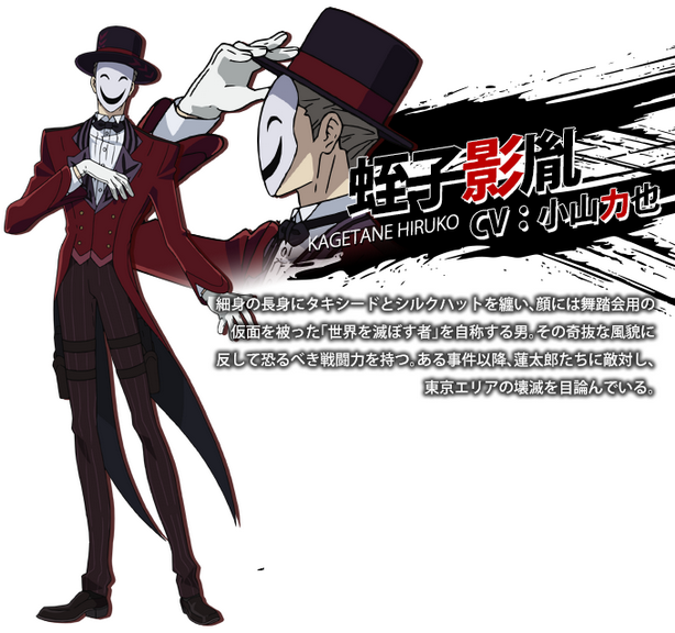 ชายปริศนาผู้สวมหน้ากากและชุดทักซิโด ไม่ทราบสังกัด แต่มีไอพีแรงค์ลำดับที่ 134 แท้ที่จริงนั้นเขาคือมนุษย์ทดลองในโครงการพัฒนามนุษย์สายพันธุ์ใหม่เพื่อต่อต้านพวกกาสเตรย์ แต่เขากลับยึดหลักแนวคิดที่ว่า ผู้แข็งแกร่งคือผู้อยู่เหนือกฎทั้งปวงบนโลก จึงทำการต่อต้านและเป็นปฏิปักษ์หน่วยงานความมั่นคง เพื่อขจัดความบิดเบี้ยวของการแบ่งชนชั้นให้หมดสิ้น มีฝีมือการต่อสู้ที่ร้ายกาจและน่ากลัว ที่มนุษย์ทั่วไปไม่สามารถต่อกรกับเขาได้ อินนิเทียเตอร์ของเขาคือโคฮินะ