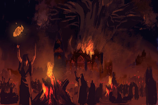 เหล่านักบวชผู้ทะยานอยากจะครองตำแหน่งด้วยความโลภ ก็พยายามที่จะปีนป่ายกองขี้เถ้าสูงเสียดฟ้า เพื่อหมายจะครองอาณาจักร แต่ทว่ากองเถ้าถ่าน ก็ยุบตัวลง กลืนกินเหล่านักบวช และเริ่มเปลี่ยนพวกเขาให้เป็นเพียงปีศาจชั่นต่ำที่รู้จักเพียงความกระหายเท่านั้น และอาณาจักแห่งนี้ก็เริ่มวุ่นวาย และดำมืดยิ่งขึ้น