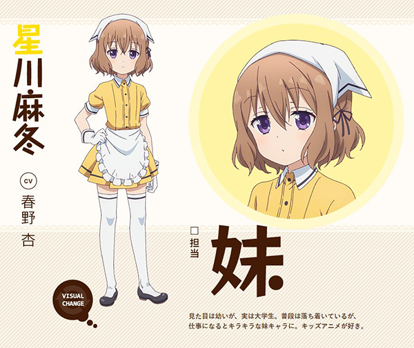 เห็นไซส์มินิแบบนี้แต่ก็เป็นสาวมหา’ลัยอายุ 20 แม้จะไม่ชอบถูกปฏิบัติเหมือนเด็กแต่คาแรกเตอร์ประจำตัวดันเป็น “Sister” หรือน้องสาวที่ต้องทำตัวออดอ้อนลูกค้าดั่งพี่ชาย ถึงกระนั้นเธอก็ทำงานได้ดีด้วยการเปลี่ยนเข้าสู่โหมดน้องสาวเวลาทำงาน