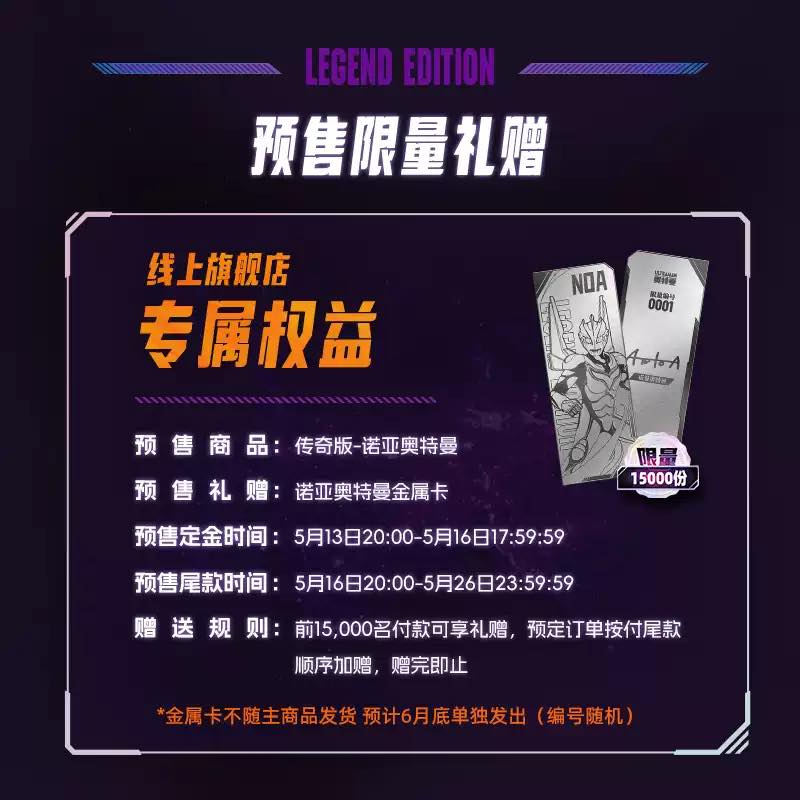 ของขวัญพรีเซลล์: การ์ดโลหะ Ultraman Noah จำกัด 15,000 ชุด สำหรับล๊อตแรก สั่งพรีก่อนได้ก่อน โดยการ์ดโลหะจะไม่ถูกส่งพร้อมกับผลิตภัณฑ์หลัก และคาดว่าจะออกแยกต่างหากในช่วงปลายเดือนมิถุนายน