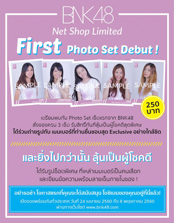 วันที่ 24 เมษายน เป็นวันที่ทาง BNK48 เปิดให้เหล่าโอตะได้สั่งจองรูปของสมาชิกวง หรือ โฟโต้เซ็ท ซึ่งใน 1 แพ็คจะมี 5ใบ โดยที่ความพิเศษของชุดนี้คือจะมีใบพิเศษ หรือ SSR ซึ่งจะมีข้อความและลายเซ็นจากเมมเบอร์ นอกจากนี้ คนที่สั่งจองครบ 3 เซ็ต ก็จะได้สิทธิ์ลุ้นถ่ายภาพกับเมมเบอร์แบบ Exclusive