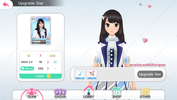 เมื่อเลเวลเต็มแล้ว ขั้นต่อไปคืออัพเกรดดาว เพื่อปลดลีอกเพดานเลเวลให้เก่งขึ้น และยังมีผลต่อเลเวลสกิลทั้งแบบสกิลติดตัว และสกิล Center อีกด้วย โดยการอัพเกรดนี้ จะต้องใช้ไอเทมเฉพาะตัวด้วย เช่น “เฌอปราง R เลเวล10″ จาก “1ดาว” ไป “2 ดาว” จะ ใช้ โน้ตน้ำเงิน 10 ตัว + จรวด 2 ลำ เป็นต้น