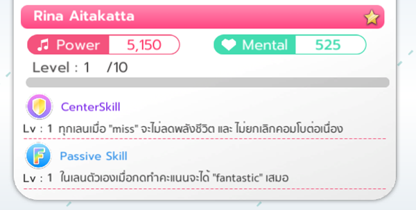 และสิ่งที่การืดทุกใบมี ก็คือ Passive Skill สกิลติดตัว ที่แสดงผลทันทีเมื่อลงสนาม มีผลเฉพาะเลนที่ตัวเองยืนเท่านั้น เช่น “ไม่ว่าจะกดอะไร ก็จะเป็น Fantastic เสมอ” หรือไม่ก็ “ทุกครั้งที่กด Perfect จะฟื้น HP กี่หน่วยก็ว่ากันไป…”ซึ่งการดูการ์ดเหล่านี้ แล้วใช้ประโยชน์ให้คุ้มค่า มันก็ดีในแง่ของเกมเมอร์ผู้ใส่ใจ แต่ถ้าเป้นโอตะ ก็ขอแค่โอชิตัวเองลงสนามก็พอแล้วล่ะ 555+