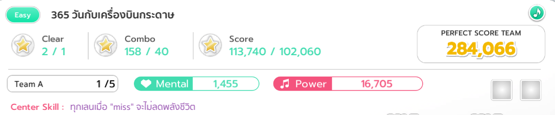 ตัวอย่างในรูปคือ Center Skill “ทุกเลนเมื่อ Miss จะไม่ลดพลังชีวิต และไม่ยกเลิกคอมโบต่อเนื่อง” หมายความว่า ระยะเวลาที่เกจ Center Skill เต็ม เวลากดพลาด จะไม่ลดพลังชีวิต และคอมโบไม่หาย นั่นเอง…