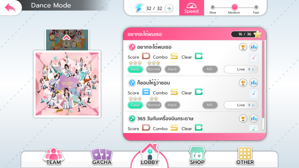 เลือกเพลงจากซิงเกิ้ลหรืออัลบั้มของ BNK48 โดยสามารถปรับระดับความยากได้ 4 ระดับ (Easy / Normal / Hard / EXTREME) อีกทั้งยังปรับความเร็วของตัวโน๊ตให้เหมาะกับคุณได้