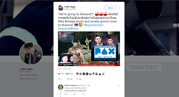 นี่คือบุคคลแห่งวงการเกมที่แฟนๆชาวไทยตั้งตารอมากที่สุดคนหนึ่ง…เขาคือนักแสดง นักสตรีม TWITCH ชื่อดังที่ตอนนี้ไม่มีชาว PS4 หรือชาวคอนโซลคนไหนไม่รู้จักเขา กับบทบาทของ คอนเนอร์ (Connor) ผู้มีภารกิจต้องตามล่าแอนดรอยด์ที่มีความรู้สึก จากเกมดราม่าเข้มข้นของปี 2018 “Detroit: Become Human” เรากำลังพูดถึง Bryan Dechart (ไบรอัน เด็กคาร์ต) ที่เกมเมอร์สาวกรี๊ดกร๊าดทั้งเมือง!