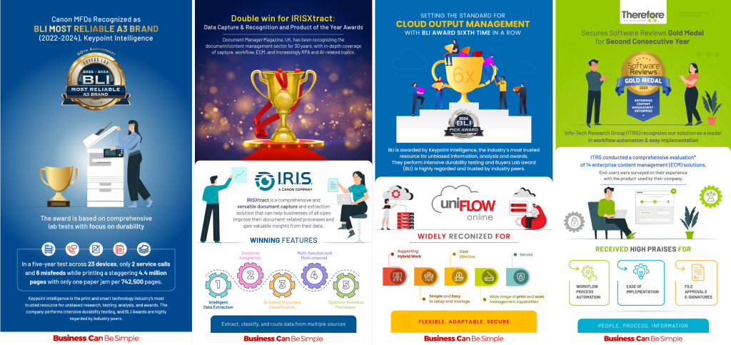 แคนนอน (Canon) เผย 4 รางวัลธุรกิจจากกลุ่มผลิตภัณฑ์บิสซิเนสอิมเมจจิ้งโซลูชั่นที่กวาดรางวัลใหญ่จากเวทีระดับโลก ครอบคลุมทั้งเครื่องถ่ายเอกสารมัลติฟังก์ชั่นประสิทธิภาพสูง โซลูชั่นระบบคลาวด์เพื่อการพิมพ์ ซอฟต์แวร์แยกประเภทเอกสาร และโซลูชั่นจัดการเอกสารอัจฉริยะ โดยทุกรางวัลเน้นย้ำถึงฟังก์ชันที่ใช้งานง่ายของผลิตภัณฑ์ของแคนนอนที่ตอบโจทย์อีโคซิสเต็มของธุรกิจองค์กรทุกรูปแบบและทุกขนาด นอกจากนี้ทั้ง 4 รางวัลยังเป็นการตอกย้ำการสร้างสรรค์ไลน์อัปผลิตภัณฑ์ที่ครบวงจรเพื่อยกระดับธุรกิจและขับเคลื่อนการทำงานแบบสมาร์ตและไม่ยุ่งยากในยุคดิจิทัลตามคอนเซ็ปต์ “Business Can Be Simple” ของแคนนอน