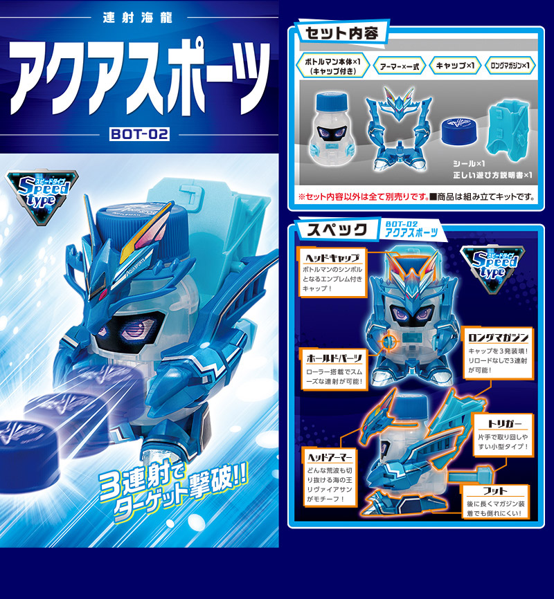 Speed Type - มีพลังในการยิงต่ำ แต่รัว เร็ว มีช่องใส่กระสุน เน้นการยิงแบบต่อเนื่องในระยะใกล้ -กลาง (ในภาพคือ “อควาสปอร์ท” หุ่นยิงฝาน้ำเกลือแร่)