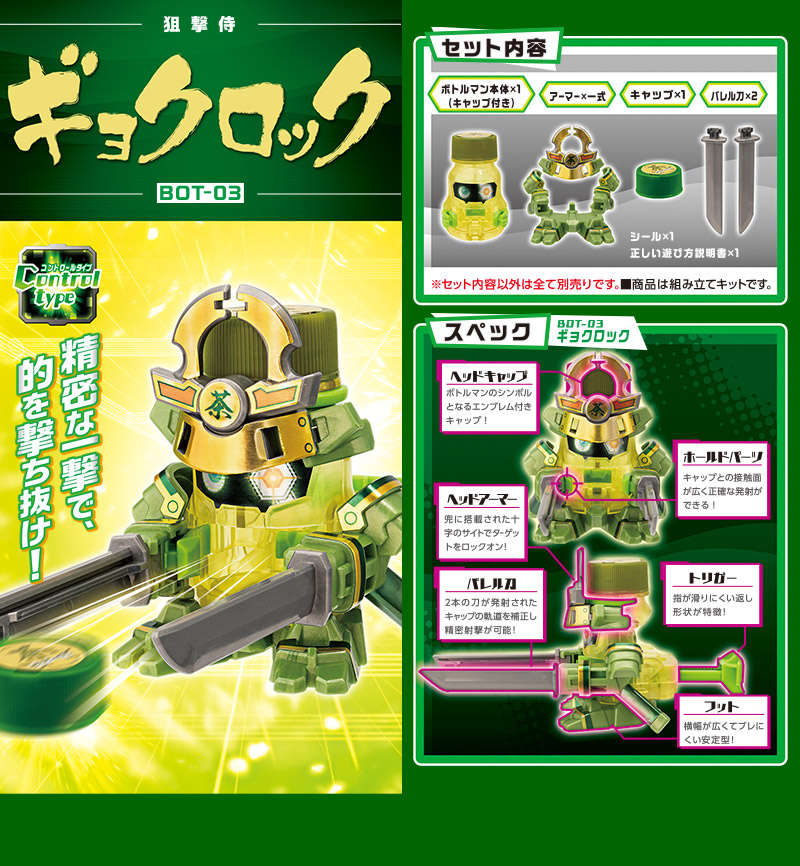 Control Type - มีความสามารถในการยิงไกลและแม่นยำด้วยศูนย์เล็ง พร้อมก้านยาวที่ยื่นเปรียบเหมือนลำกล้องปืน ที่ทำให้กระสุนที่ยิงมีความแม่นยำมากขึ้น (ในภาพคือ”เกียวคล๊อค” หุ่นยิงฝาชาเขียว)