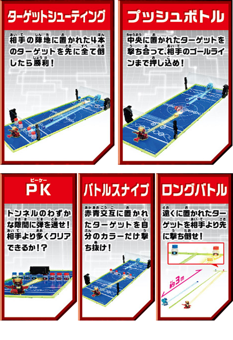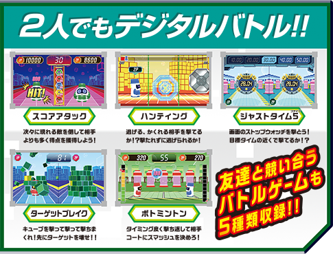 จะเป็นการเล่นร่วมกับเครื่องเล่นเกมนินเทนโดสวิทช์ โดยหลักแล้ว ในชุดจะมีแป้นรับกระสุน สำหรับติดฐานเครื่องนินเทนโดสวิทช์มาให้ พร้อมขวดจิ๋ว และสนามสำหรับเล่น โดยจะมีมินิเกมต่างๆแยกมาอีก 5 เกมดังนี้