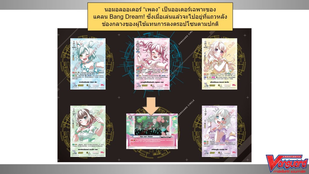 ซึ่งการ์ดใดๆที่เคยอยู่บนแถวหลังช่องกลางนั้น จะถูกส่งลงดรอปโซน เมื่อออเดอร์เพลงลงสนาม