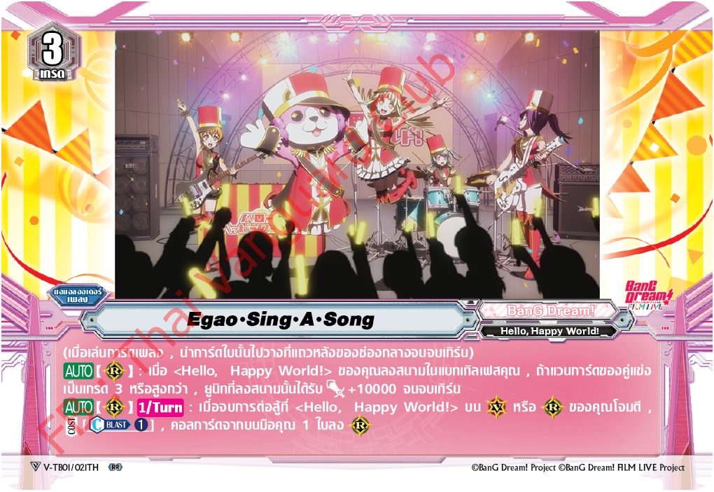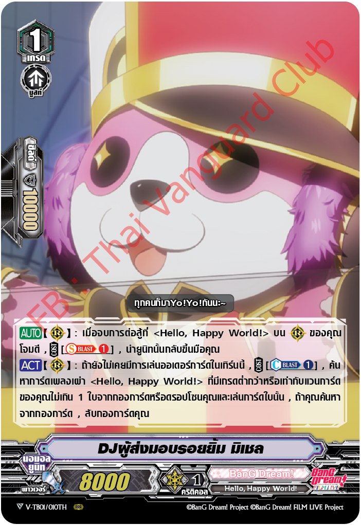 -ถ้ามีแวนการ์ด หรือเรียร์กร์ด สาย Hello Happy World โจมตีเสร็จ คว่ำ 1แดม โดดจากมือ ลงช่องเรียร์ได้