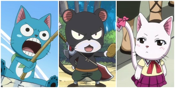 ถ้าพูดถึงแมวเจ๋งๆ มันก็ต้องนึกถึงแมวทั้งสามตัวจากเรื่อง Fairy Tail อย่าง แฮ็ปปี้(สีฟ้า) ,  แพนเตอร์ ลิลลี่ (สีดำ) และ ชาร์ล (สีขาว) สิ!! นี่นอนว่าทั้งสามพูดได้ แถมมีบทพูดเป็นจริงเป็นจัง เฮฮาไร้สาระบ้าง เป็นงานเป็นการบ้าง แต่นั่นก็ยังไม่เท่าความสำคัญในคาแร็กเตอร์แต่ละตัว เริ่มต้นจาก “แฮ็ปปี้” แมวพลังเวทย์ที่สามารถบินได้ ส่วน “แพนเตอร์ ลิลลี่” ก็สามารถกลายร่างได้ขนาดเท่ามนุษย์และมีขนสีดำ จนนึกว่าเสือดำรึเปล่า? อีกทั้งมีความสามารถในการต่อสู้ โดยใช้ดาบเวทย์อีกด้วย สุดท้าย “ชาร์ล” แมวสาวลูกสาวสวยเชิดจากตระกูลสูงส่ง ผู้มีความสามารถในการทำนายอนาคต และแปลงร่างเป็นเด็กผู้หญิงได้ด้วย