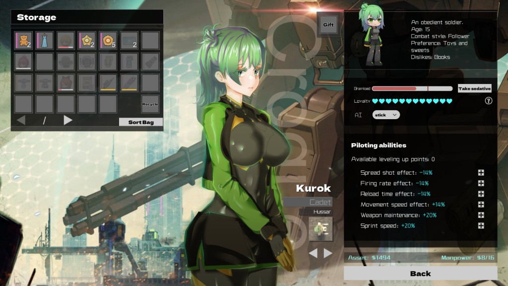 เมื่อคุณเล่นเนื้อเรื่องไปซักพัก ตัวละครใหม่ๆ ก็จะปลดล๊อก พวกเธอเป็นนักบินที่มีค่าบัฟ ความถนัด และความเหมาะสมในการเล่นแตกต่างกันออกไป เช่น ความเร็วในการรีโหลดและการกระจายการยิง และ มอบของขวัญให้สาวๆ เพราะไอเทมพวกนี้ จะเป็นการเพิ่มประสิทธิภาพตัวละคร จากการติดตั้งไอเท็มเฉพาะ ที่ล๊อกให้ตัวละครนั้นๆใช้เท่านั้นอีกด้วย รวมไปถึงระบบการตกแต่งหอพักให้ดูอบอุ่น ก็สามารถทำได้เช่นกัน