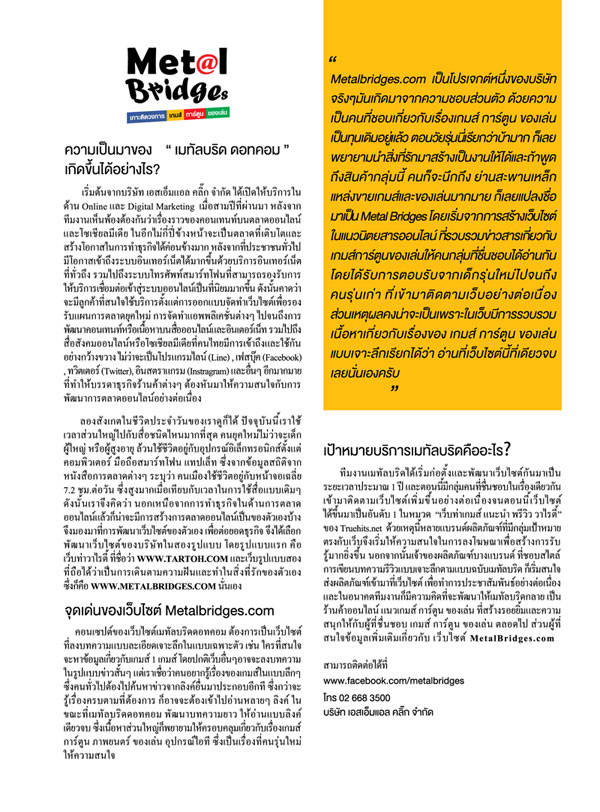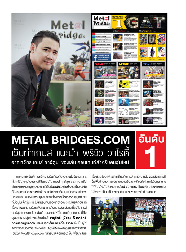 ” Metalbridges.com เป็นโปรเจกต์หนึ่งของบริษัท จริงๆมันเกิดมาจากความชอบส่วนตัว ด้วยความเป็นคนที่ชอบเกี่ยวกับเรื่องเกมส์ การ์ตูน ของเล่น เป็นทุนเดิมอยู่แล้ว ตอนวัยรุ่นนี่เรียกว่าบ้ามากก็เลยพยายามนำสิ่งที่รักมาสร้างเป็นงานให้ได้และถ้าพูดถึงสินค้ากลุ่มนี้ คนก็จะนึกถึง ย่านสะพานเหล็กแหล่งขายเกมส์และของเล่นมากมาย ก็เลยแปลงชื่อมาเป็น Metal Bridges โดยเริ่มจากการสร้างเว็บไซต์ในแนวนิตยสารออนไลน์ ที่รวบรวมข่าวสารเกี่ยวกับเกมส์การ์ตูนของเล่นให้คนกลุ่มที่ชื่นชอบได้อ่านกัน โดยได้รับการตอบรับจากเด็กรุ่นใหม่ไปจนถึงคนรุ่นเก่า ที่เข้ามาติดตามเว็บอย่างต่อเนื่องส่วนเหตุผลคงน่าจะเป็นเพราะในเว็บมีการรวบรวมเนื้อหาเกี่ยวกับเรื่องของ เกมส์ การ์ตูน ของเล่น แบบเจาะลึกเรียกได้ว่า อ่านที่เว็บไซต์นี้ที่เดียวจบเลยนั่นเองครับ “