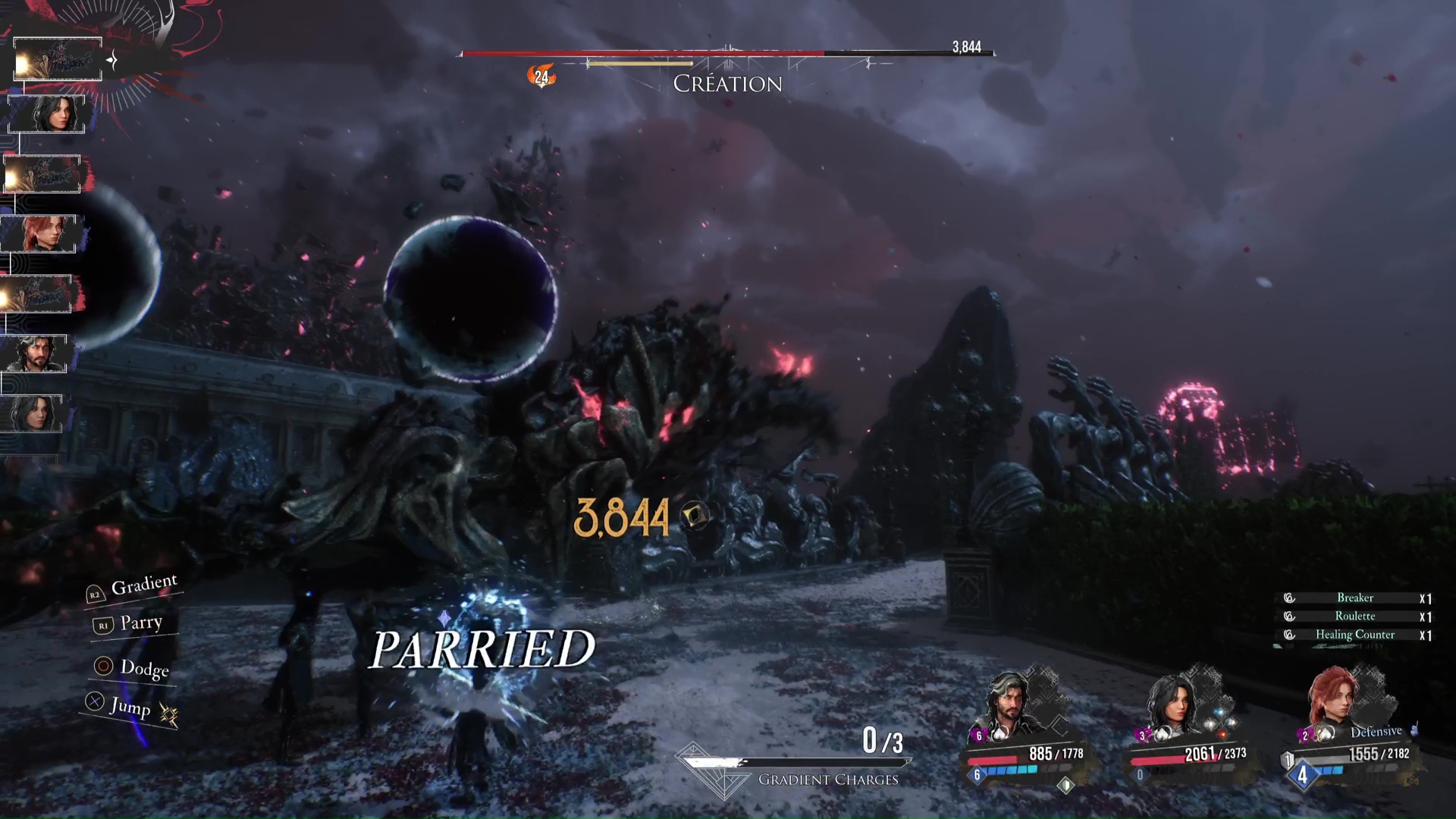 และไฮไลท์คือระบบ Parry ที่เกมนี้ใส่มา จัดว่าทำให้เกมมีความตึงเครียด ดุเดือดมากกว่า Turnbase ทั่วไป เพราะเกมจะผลักดันให้ผู้เล่นมีสติตลอดเวลาระหว่างเล่น มีส่วนร่วมในการต่อสู้ ประหนึ่งเกมตระกูลโซล ซึ่งศัตรูแต่ละตัวจะมีการออกท่าที่มีทั้งปัดทิ้งได้ หรือบังคับหลบอย่างเดียว และ การทำอนิเมชั่นของศัตรูแต่ละตัวในเกม ที่จัดว่ากวนประสาทสุดๆ เพราะบางตัวมีการดึงจังหวะด้วยการออกท่าทางหลอกๆ เพื่อให้เราสับสน และป้องกันพลาดด้วย