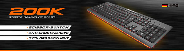 เจ้าคีย์บอร์ดที่เราจะมาพูดถึงกันในวันนี้ เป็นคีย์บอร์ดที่มีขนาดค่อนข้างเล็ก และราคาย่อมเยา นั่นก็คือ Cougar 200K Scissor Gaming Keyboard นั่นเอง เจ้า Cougar 200K ตัวนี้ ใช้ระบบสวิตช์เป็นแบบ SCISSOR – SWITCH MECHANISM โดยสวิตช์แบบใหม่นี้ โดดเด่นด้านการตอบสนองที่ดี เป็นรูปแบบ ปุ่มเตี้ย ซึ่งทาง Cougar ได้ให้คำนิยามไว้ว่า ตอบสนองได้อย่างรวดเร็ว และพิมได้เงียบนั่นเอง